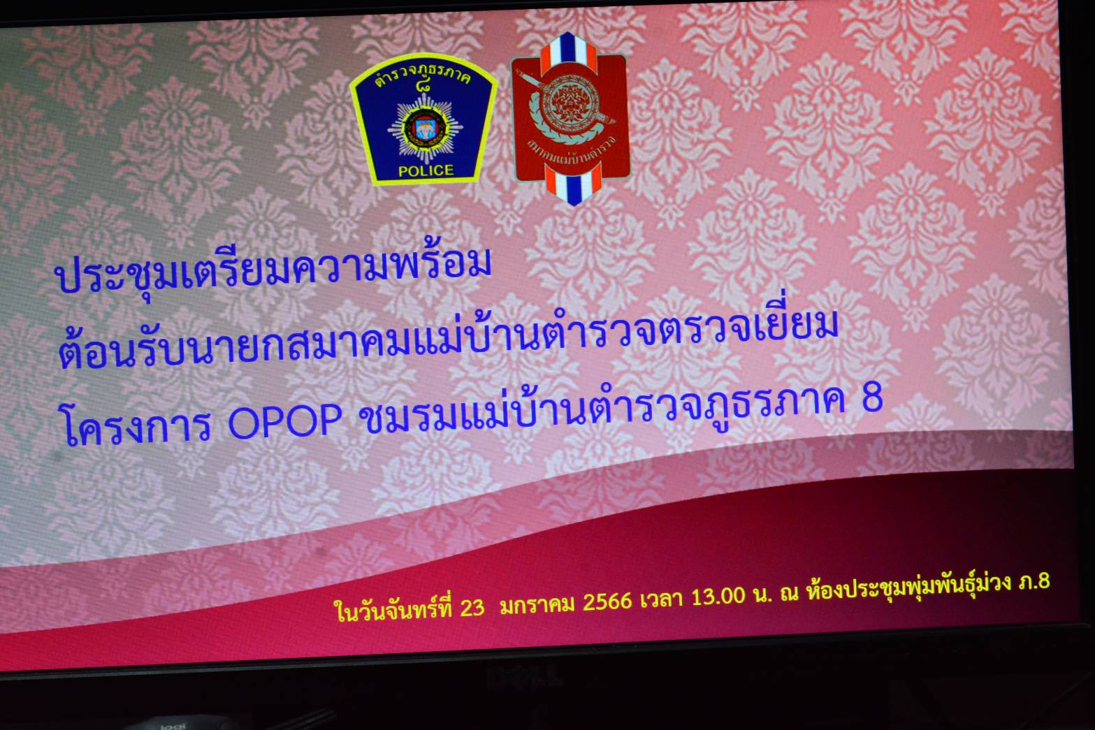 🗓 23 ม.ค.2566 เวลา ⏱ 13.00 น. 👮‍♂️ พล.ต.ท.สุรพงษ์​ ถนอมจิตร ผบช.ภ.8 ในฐานะเป็นประธานฯ​ พร้อมด้วยคณะข้าราชการตำรวจในสังกัดภูธรภาค​ 8​ และเจ้าหน้าที่ที่เกี่ยวข้อง ร่วมกันประชุมเตรียมความพร้อม ต้อนรับนายกสมาคมแม่บ้านตำรวจตรวจเยี่ยมโครงการ OPOP ชมรมแม่บ้านตำรวจ ภ.8 ณ ห้องประชุมพุ่มพันธุ์ม่วง ภ.8