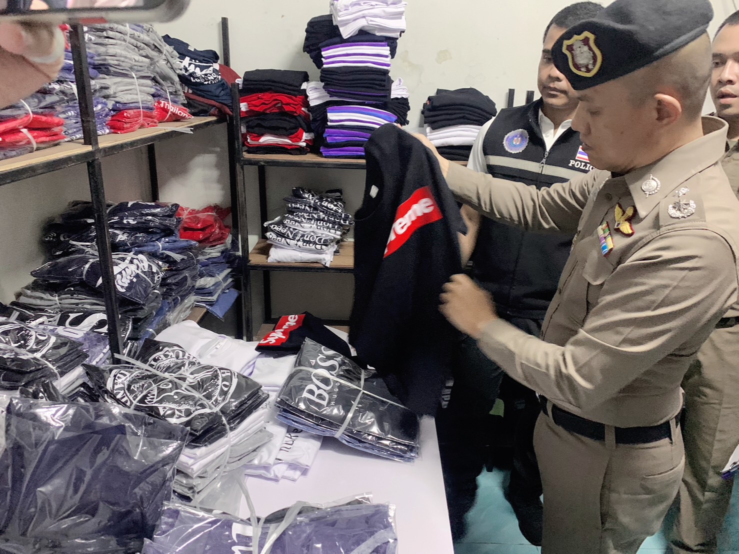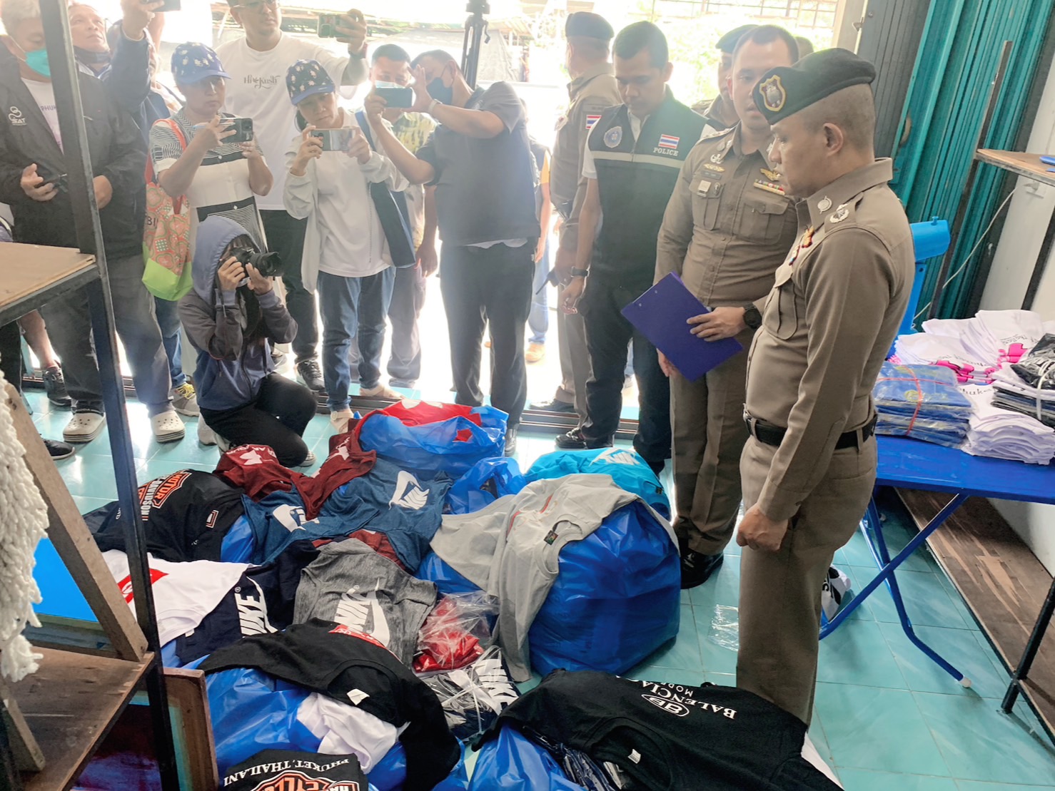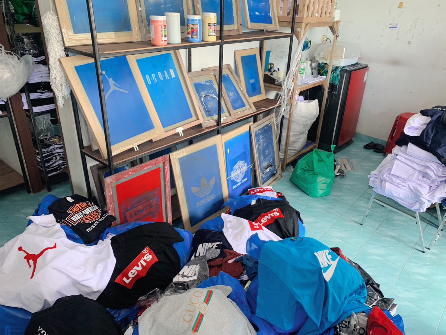 📌พร้อมด้วยของกลาง เสื้อยืดปลอมเครื่องหมายการค้าและบล๊อคสกรีนที่มีเครื่องหมายการค้ายี่ห้อ