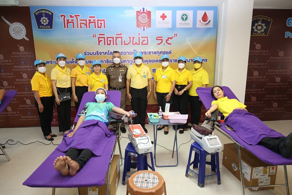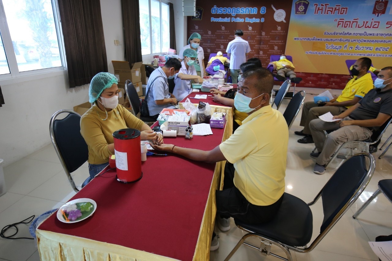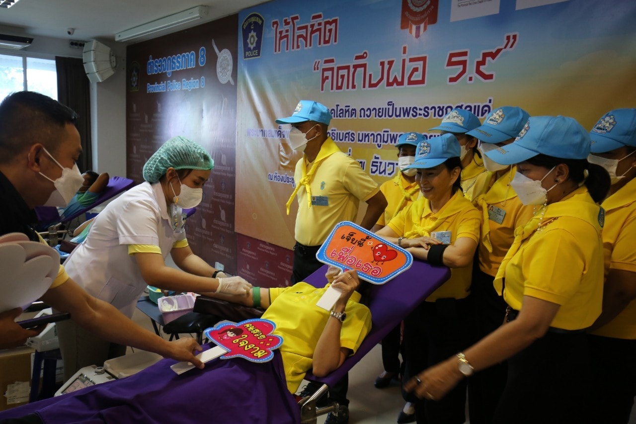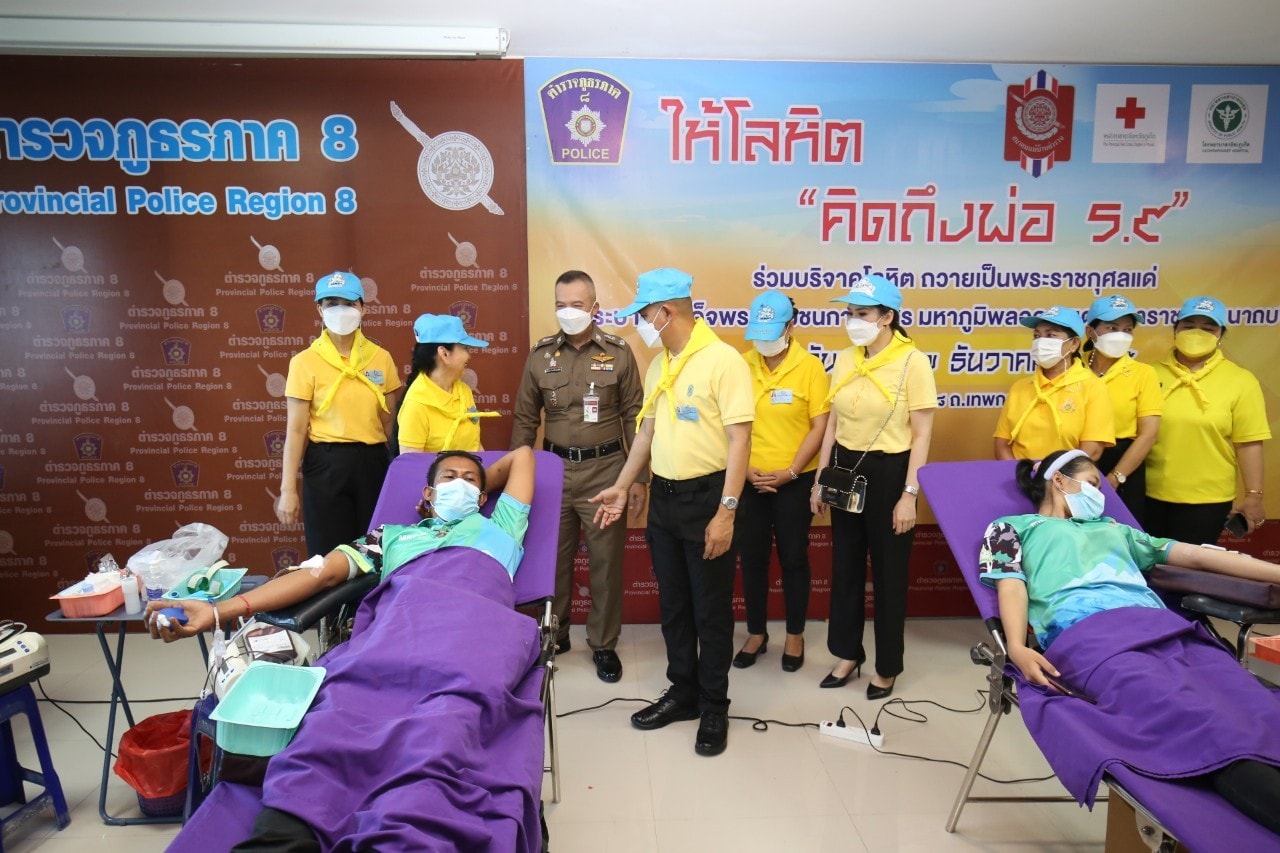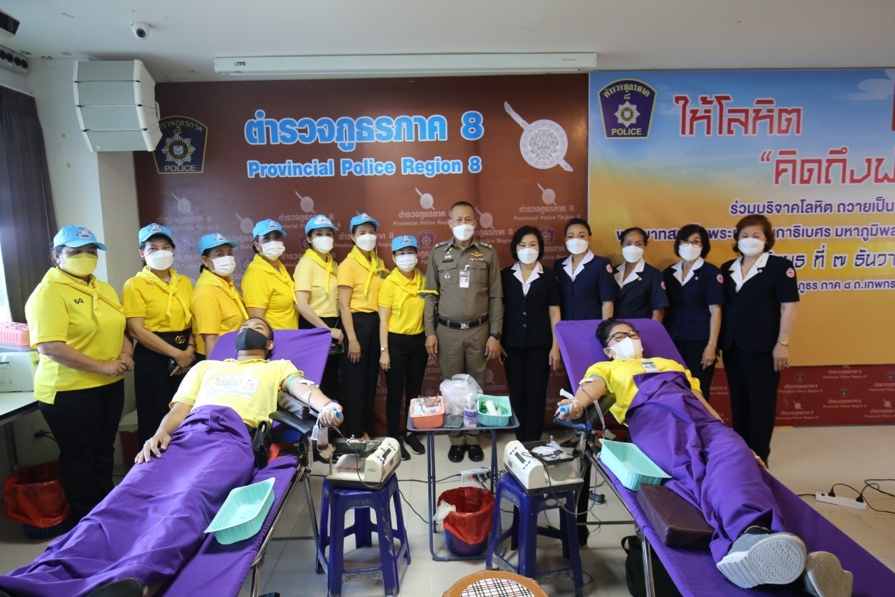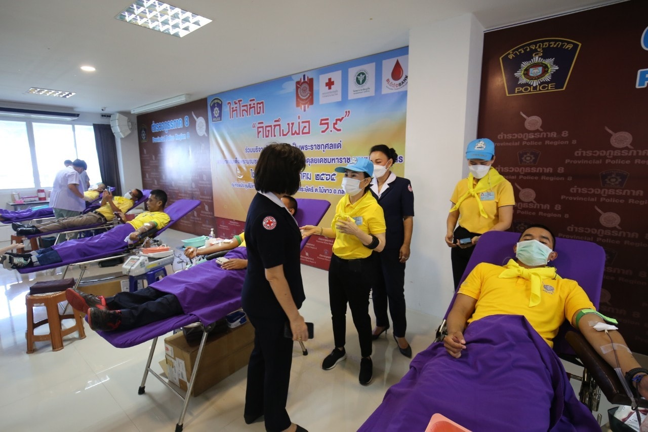 👮‍♂️ พล.ต.ท.สุรพงษ์ ถนอมจิตร ผบช.ภ.8 มอบหมายให้ พล.ต.ต.ศักย์ศิรา เผือกอ่ำ รอง ผบช.ภ.8 พร้อมด้วย , พล.ต.ต.นิพนธ์ รัตนสิริแสงโชติ ผบก.อก.ภ.8 , นางกัญญา แสงฤทธิ์ ตัวแทนสมาคมแม่บ้านตำรวจภูธรภาค 8 , เจ้าหน้าที่ที่เกี่ยวข้อง ➡️ ตรวจเยี่ยมให้กำลังใจผู้บริจาคโลหิตในโครงการ ให้โลหิต คิดถึงพ่อ ร.9