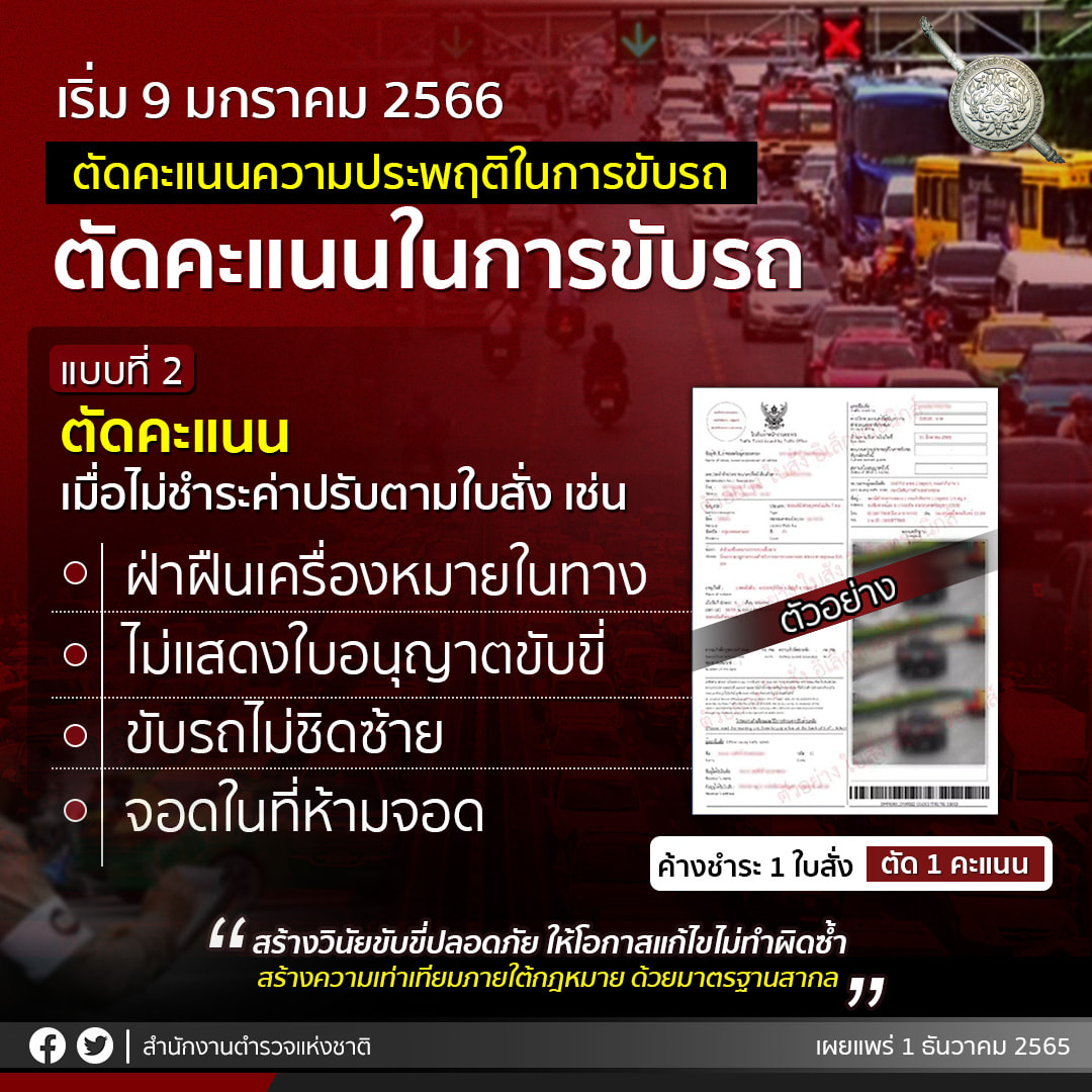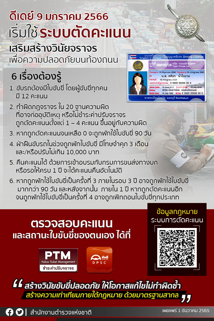 🗓 9 มกราคม 2566 เริ่มใช้ระบบตัดคะแนนความประพฤติในการขับรถ #เสริมสร้างวินัยจราจร #เพื่อความปลอดภัยบนท้องถนน