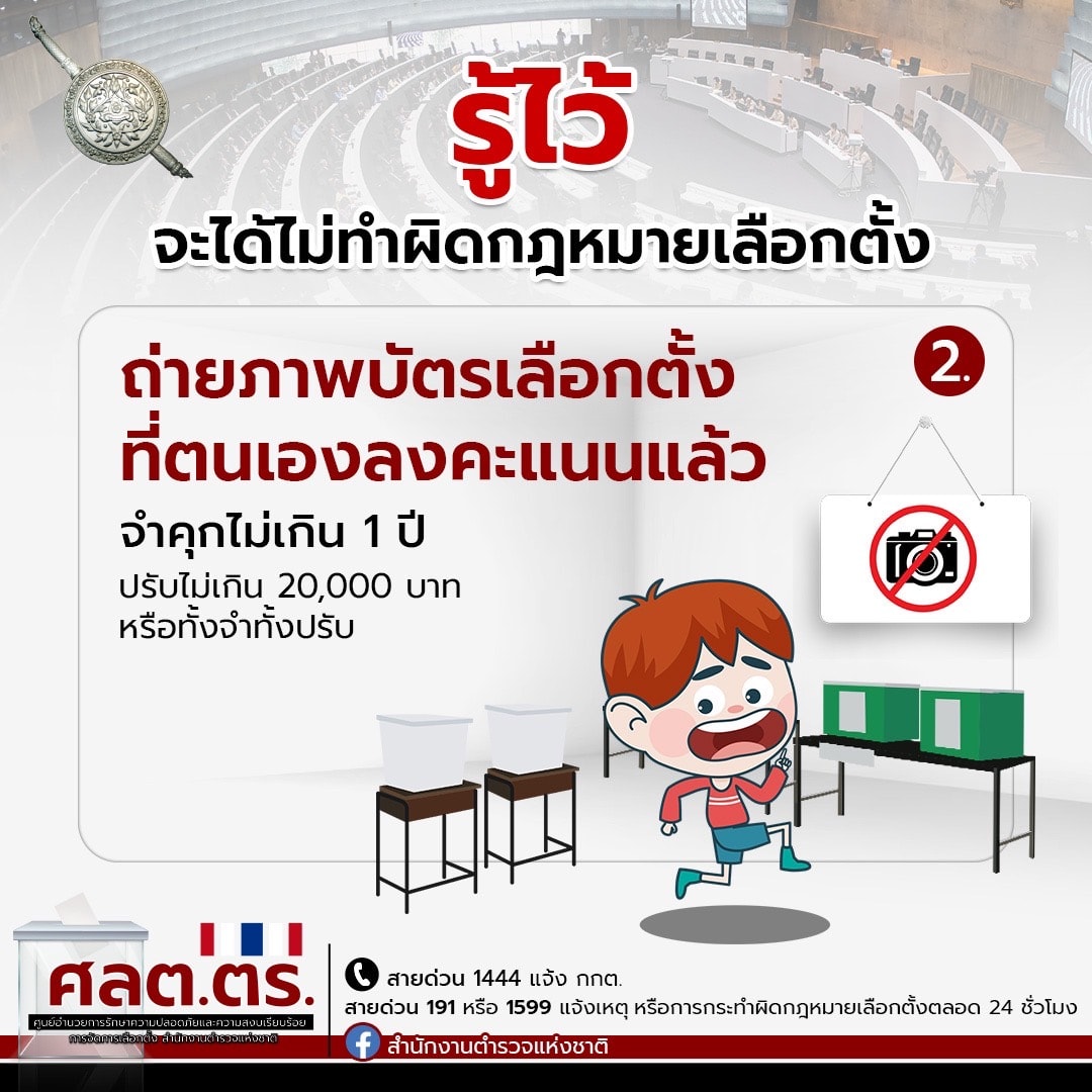 2. ถ่ายภาพบัตรเลือกตั้งที่ตนเองลงคะแนนแล้ว ฝ่าฝืนมีโทษ จำคุกไม่เกิน 1 ปี