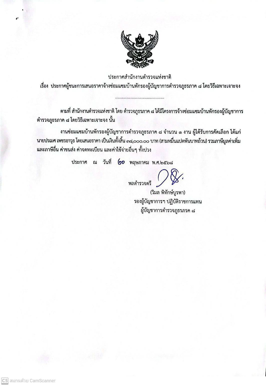 ประกาศผู้ชนะการเสนอราคา จ้างปรับปรุงบ้านพักรองผู้บัญชาการตำรวจภูธรภาค 8