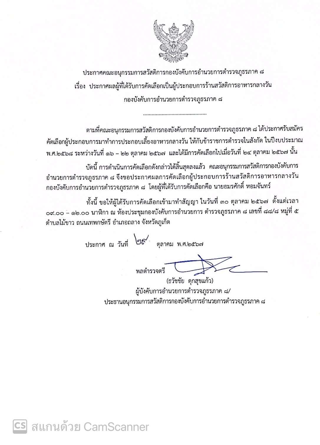 การคัดเลือกผู้ประกอบการร้านสวัสดิการอาหารกลางวัน กองบังคับการอำนวยการตำรวจภูธรภาค 8